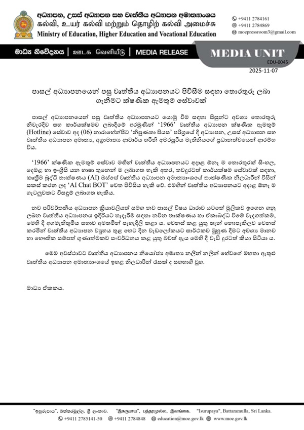 Through the ‘1966’ hotline, students can access vocational education information in Sinhala, Tamil, and English.