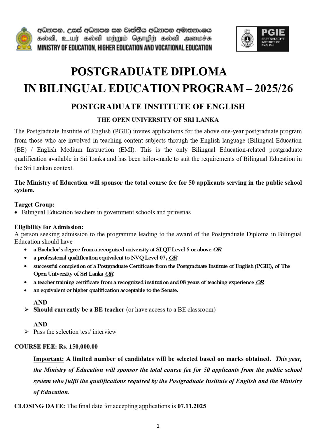 Fifty scholarship opportunities are now open for the Postgraduate Diploma in Bilingual Education. The Ministry of Education, through its Bilingual Education Branch, in collaboration with the Postgraduate Institute of English (Open University of Sri Lanka), is inviting applications from teachers currently engaged in bilingual education.
