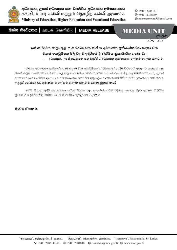 Secretary to the Ministry of Education Nalaka Kaluwewa stated that the alleged draft document, which is being shared as a 2026 education reform proposal, has not been issued or approved by the Ministry or any of its affiliated institutions.