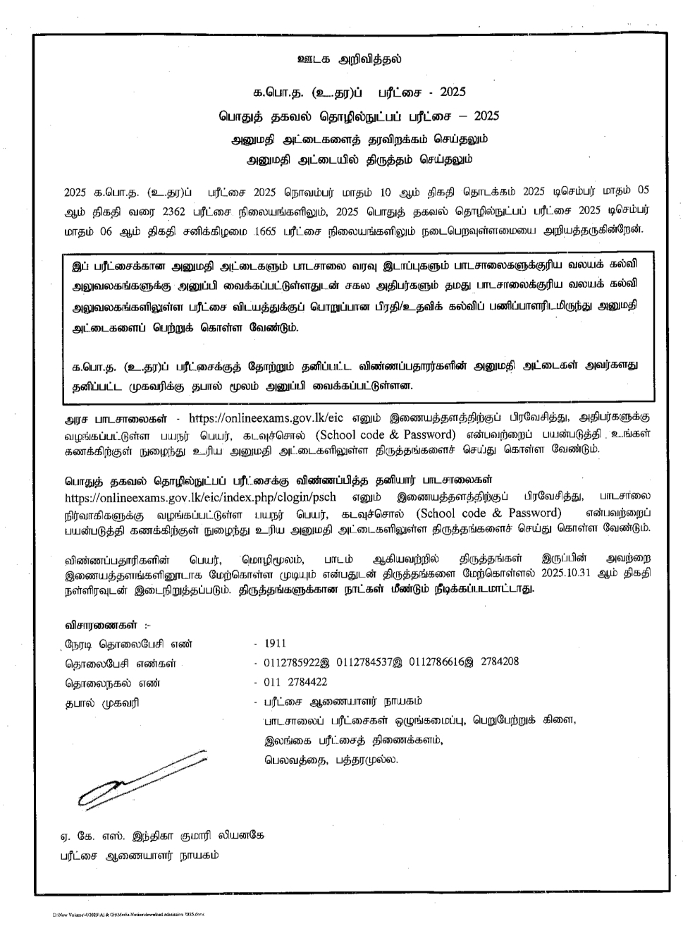 The Department of Examinations has confirmed that the 2025 G.C.E. Advanced Level (A/L) Examination will be held from 10 November to 05 December 2025.