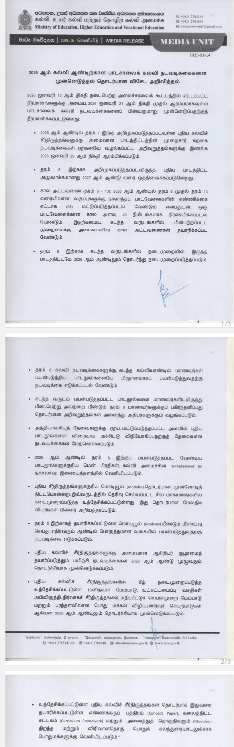 The Education Ministry further said that the syllabus implemented for Grade 06 in previous years will remain in effect for the year 2026.