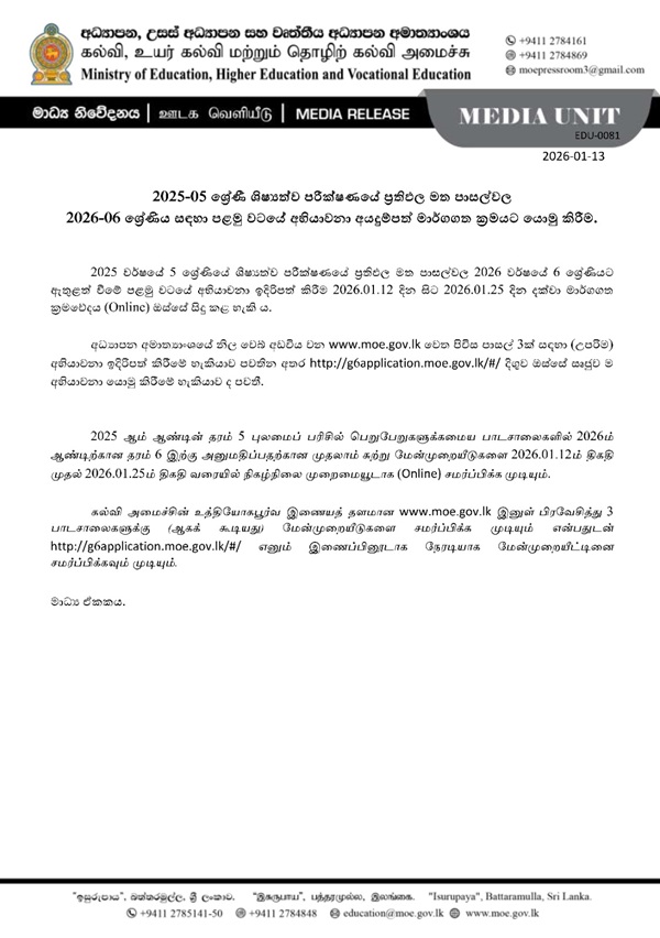 The Ministry of Education has announced that, based on the results of the 2025 Grade 5 Scholarship Examination, the first round of appeals for admission to Grade 6 in schools for the year 2026 can be submitted online.