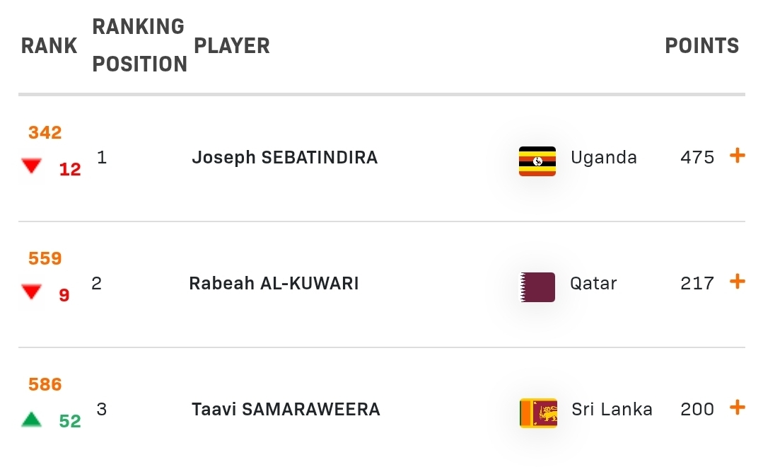 According to the International Table Tennis Federation (ITTF) rankings released this week, Samaraweera surged 52 points to reach the third spot with 200 points, trailing Uganda’s Joseph Sebatindira and Qatar’s Rabeah Al-Kuwari.