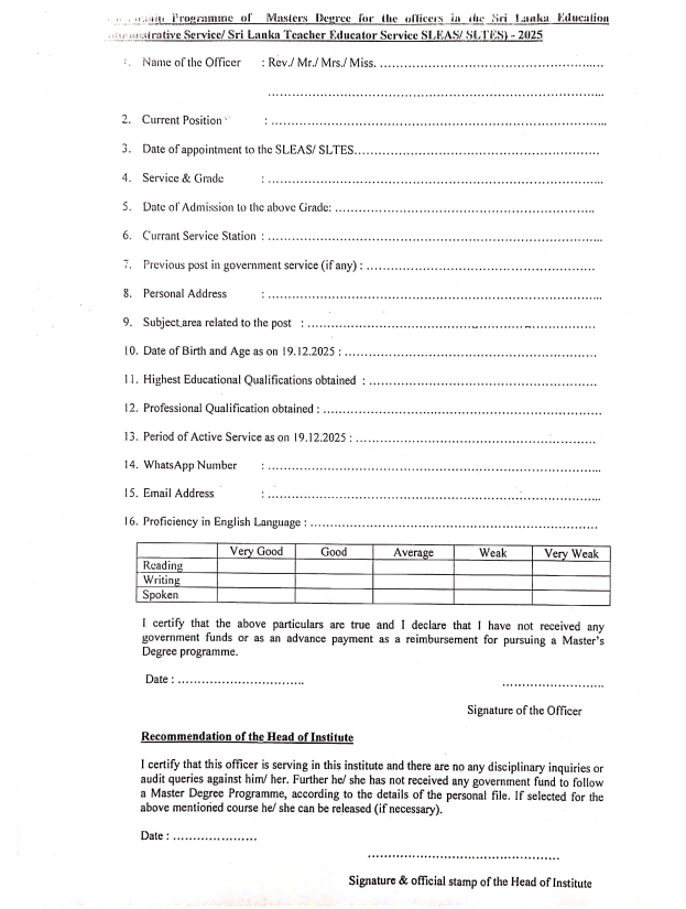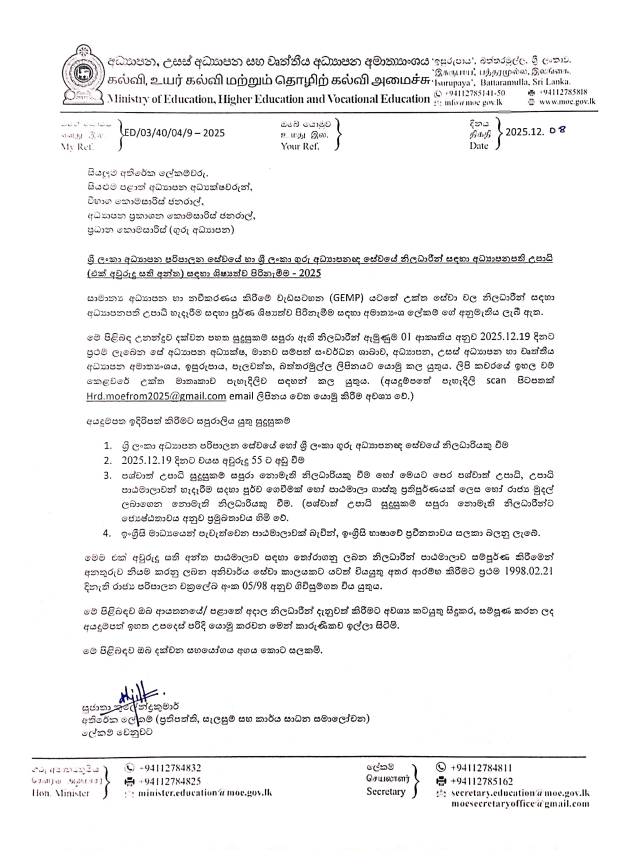 Applications are now open for officers who meet the required criteria. Completed applications, prepared according to Annexure 01, must reach the Director (Human Resource Development), Ministry of Education, Isurupaya, Pelawatta, Battaramulla on or before 19 December 2025.