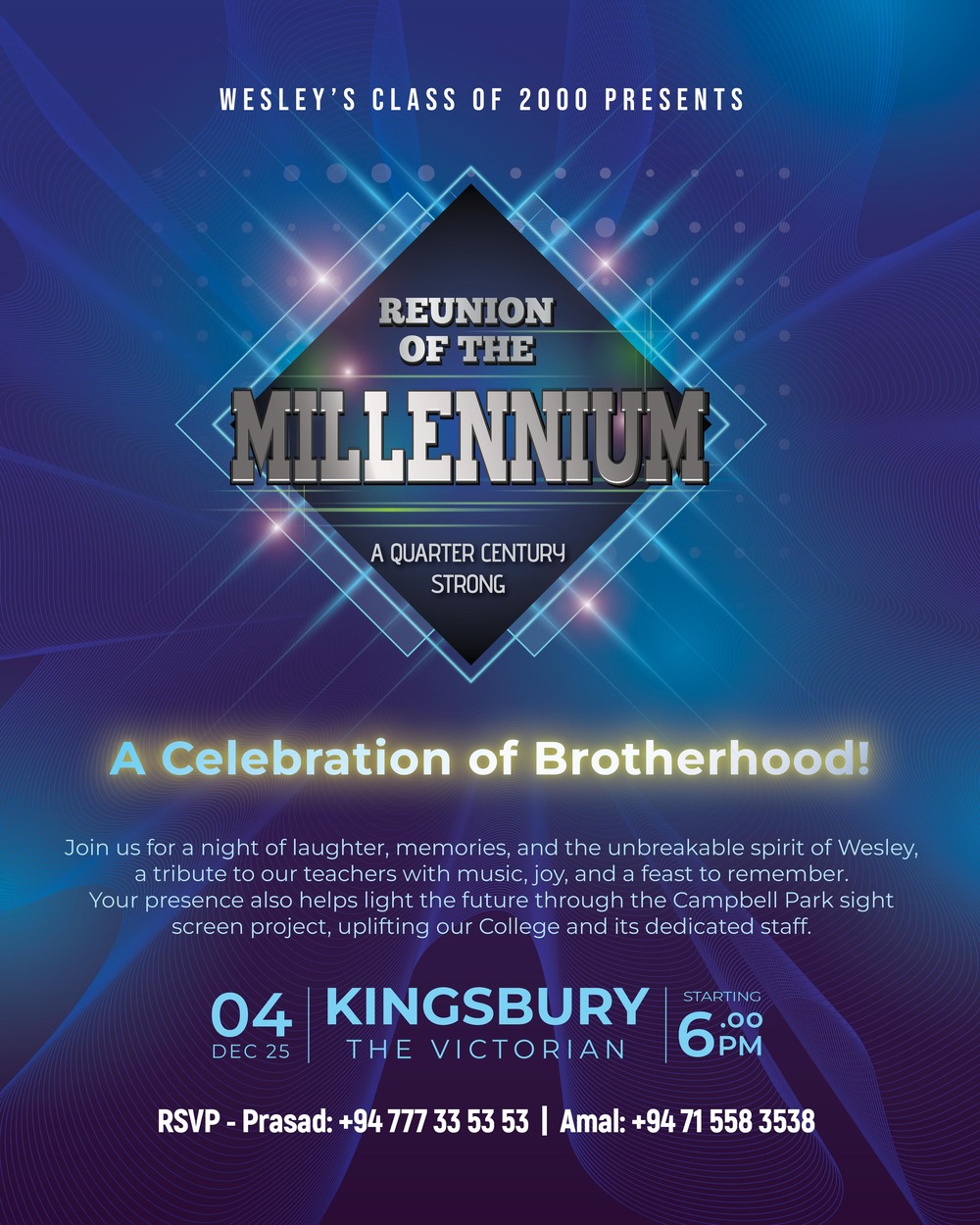The Wesley College Colombo Class of 2000 today announced plans for the Reunion of the Millennium, a landmark gathering to be held on 4 December 2025 at The Kingsbury, Colombo.